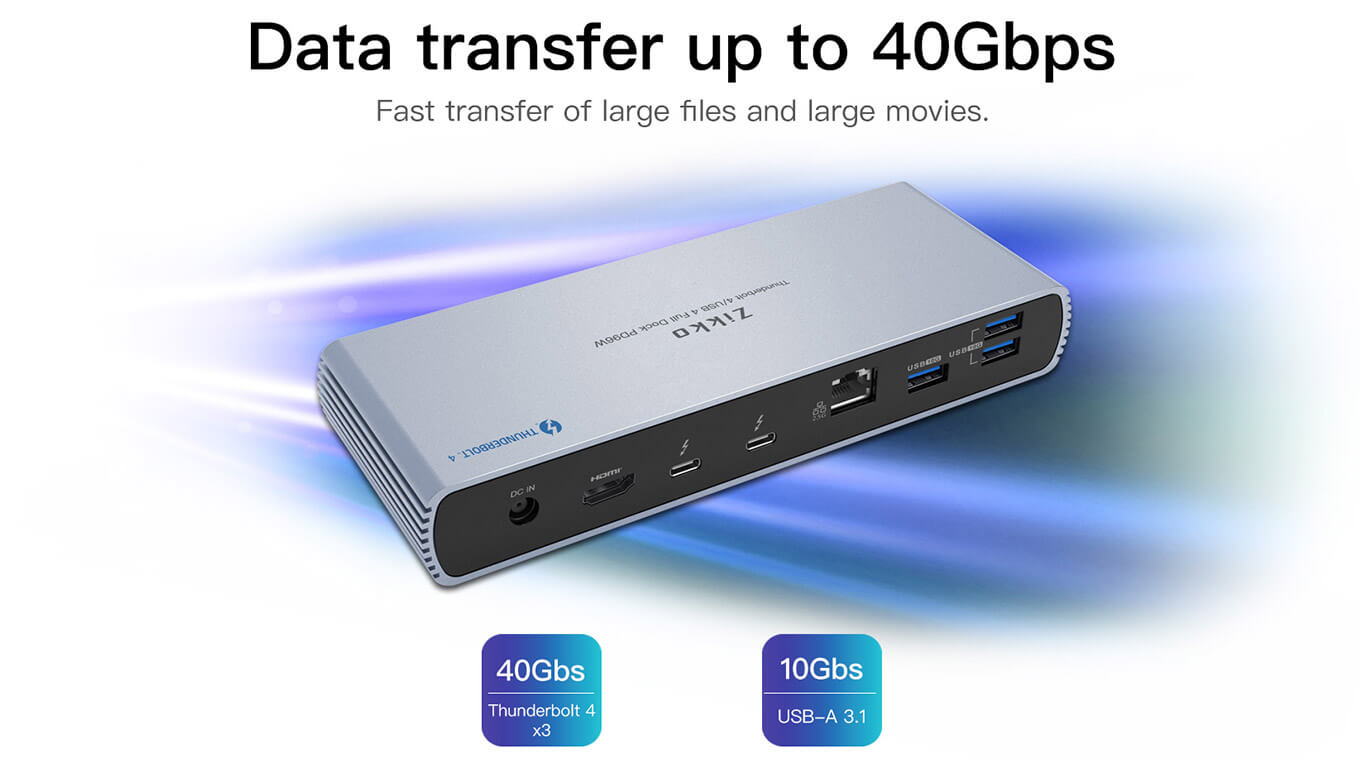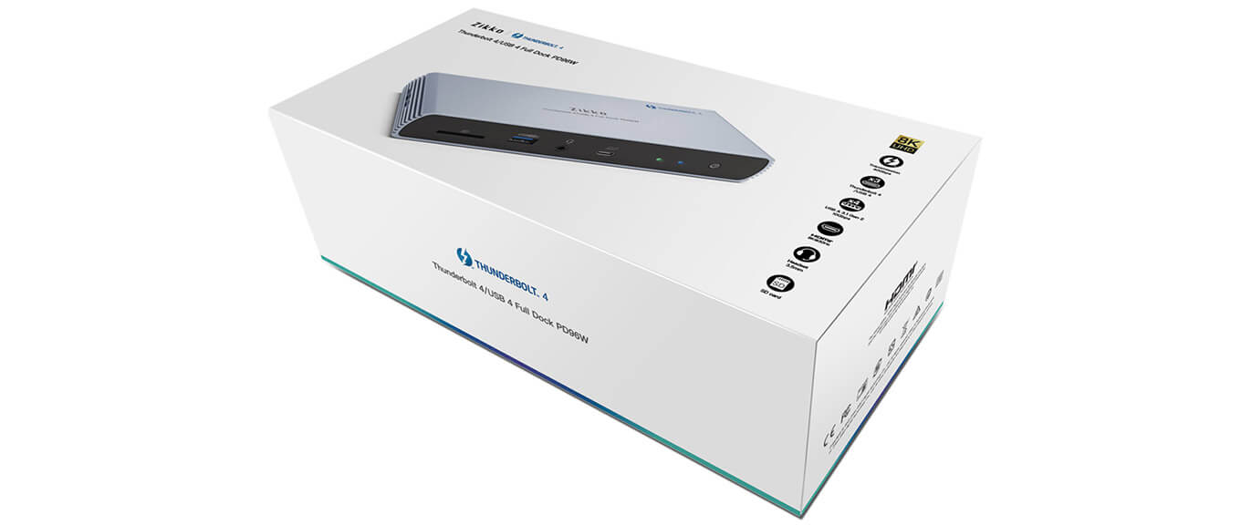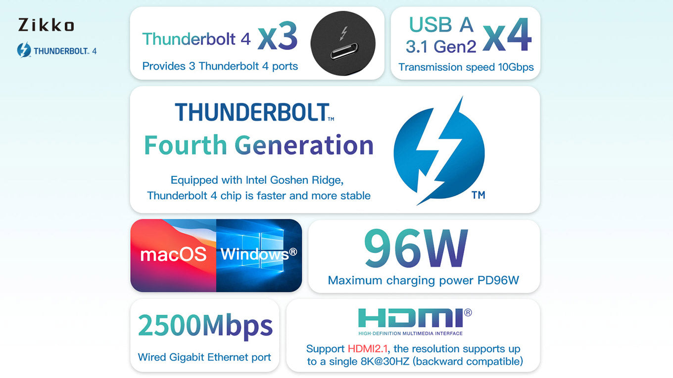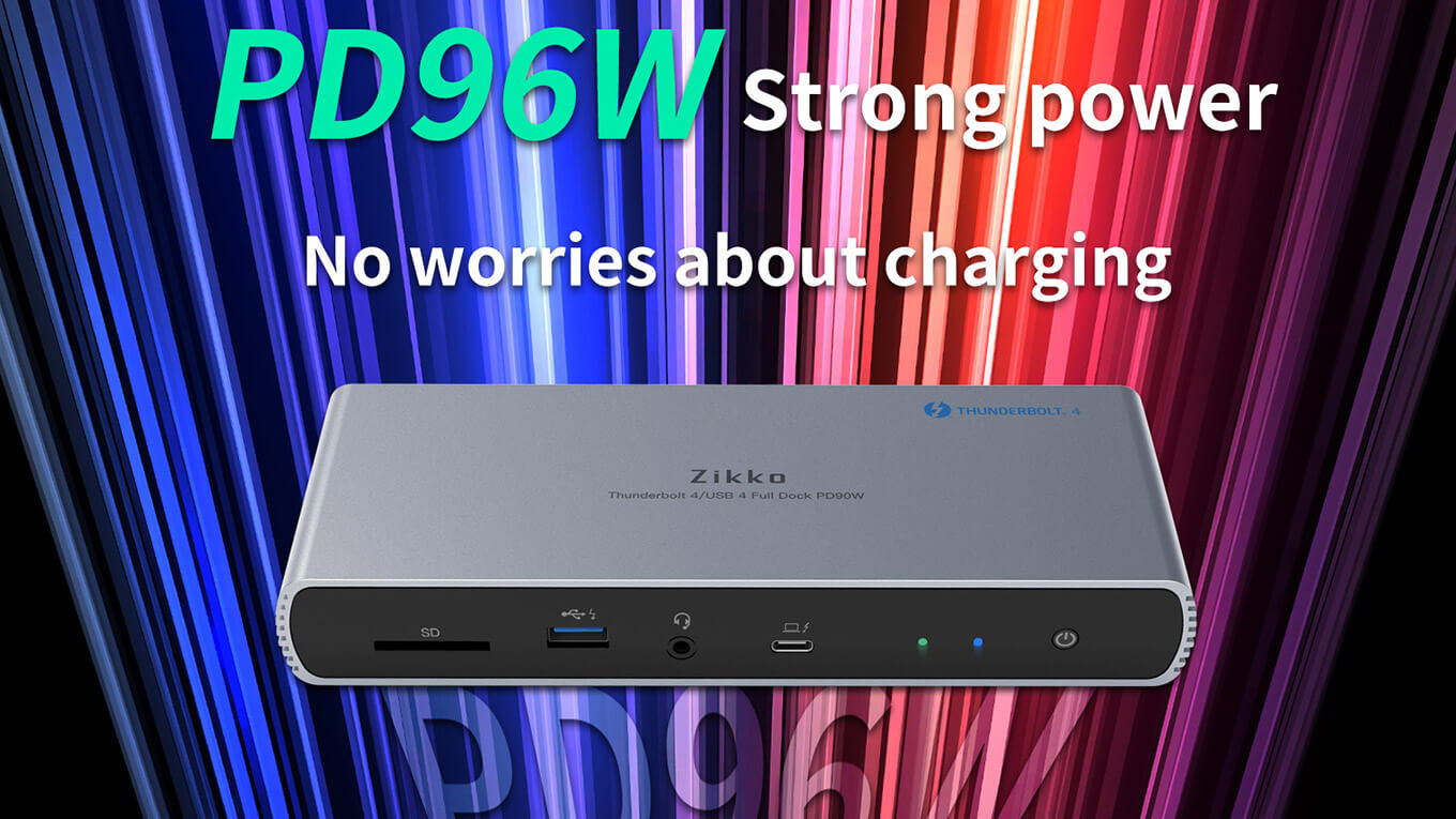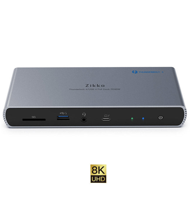Zikko Thunderbolt 4 / USB 4 Full Dock (Model: M-TBD4096) is a professional-grade docking station, based on the Intel Thunderbolt 4 Goshen Ridge controller, designed to meet the demanding requirements of high transfer rate work. It is not only suitable for Thunderbolt 4 devices, but also backward compatible with Thunderbolt 3, USB 2.0 , VESA Alternate Mode (MFDP) and USB4, and is also suitable for Windows and Mac systems.