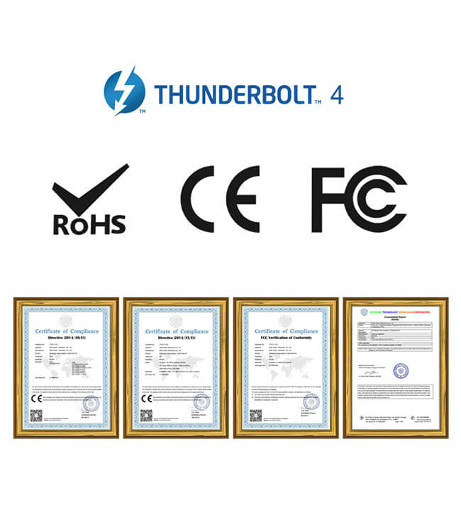 CE & FCC & Thunderbolt 4/USB 4 Declaration of Conformity: M-TBD4085 complies with EU CE, RoHS, FCC and other relevant specifications.At the same time, our products still meet the requirements of Thunderbolt 4/USB 4 technical specifications, and have obtained relevant certification and authorization. The included Thunderbolt 4 cable is compliant with certification.