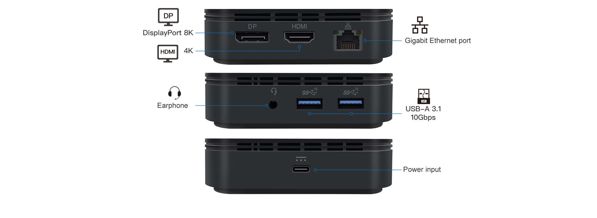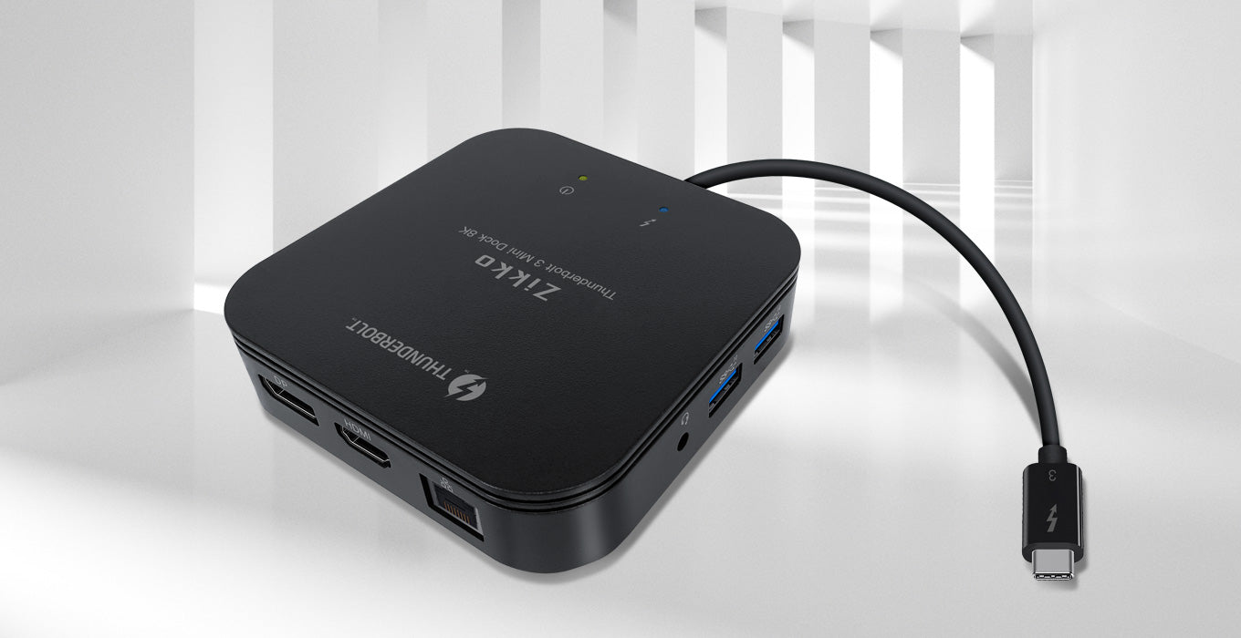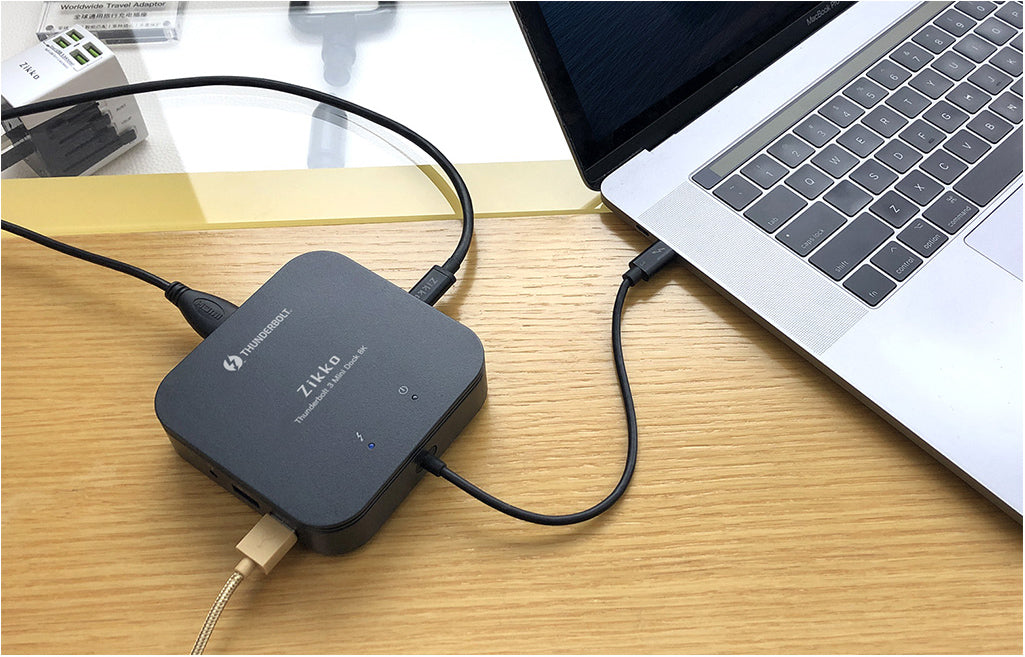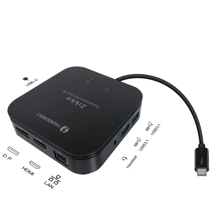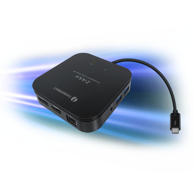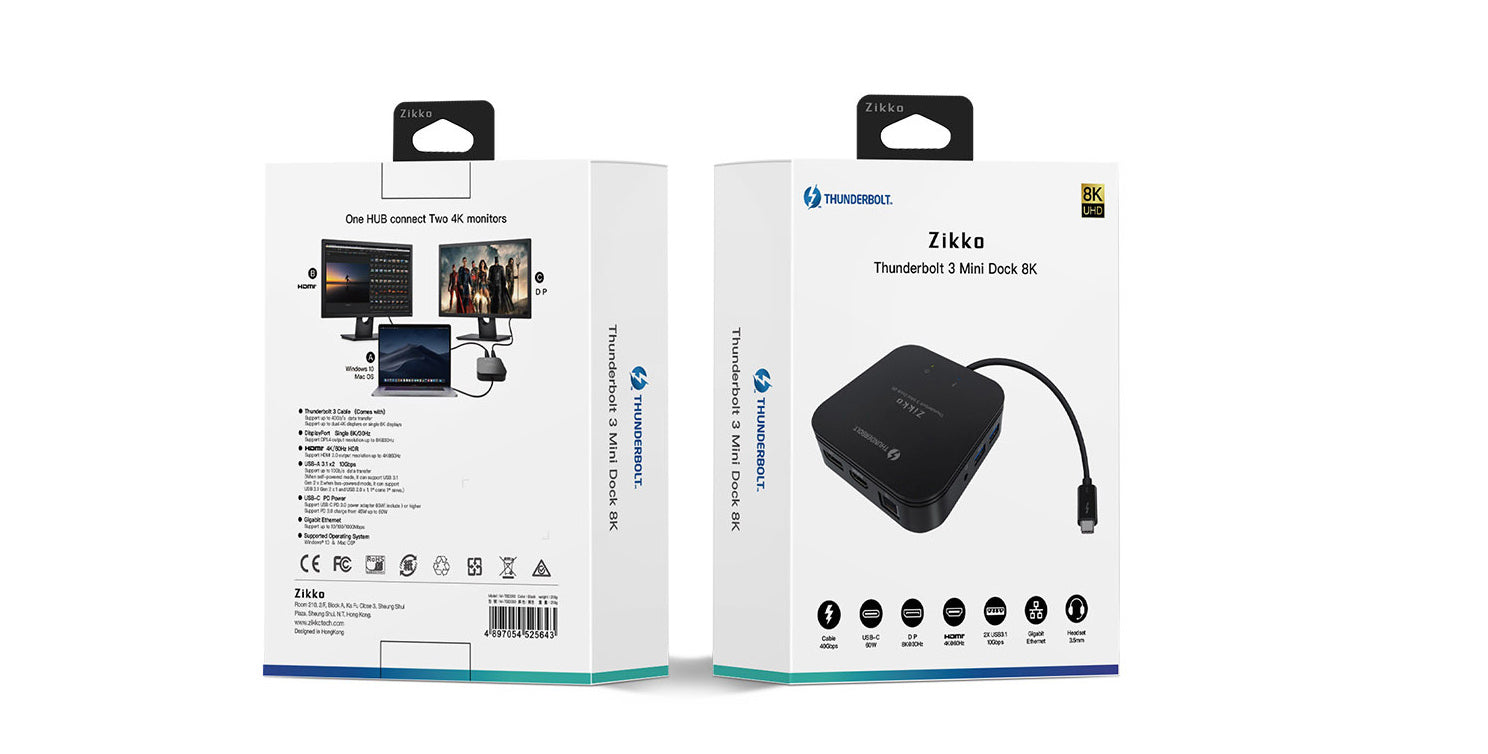 Zikko Thunderbolt 3 PD60W 8K Mini Docking Station (Model: M-TBD060) is a dual-power supply mode designed for the Thunderbolt 3-port notebook peripherals. The dock comes with a Thunderbolt 3 data cable, which can directly transmit data and supply power. A smart high-speed dock port integrating USB 3.1, DisplayPort, HDMI, Ethernet, speaker & microphone, equipped with a PD power input port of USB-C up to 60W, which can be charged upstream through an external power supply, and is used for notebook video output At the same time provide durable power. Built-in driver, plug and play, no need to install other drivers.