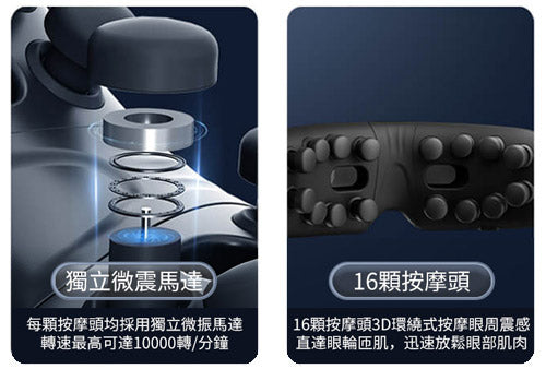 16顆獨立按摩頭  |  40℃恆溫眼袋熱敷  |  藍牙智連音樂隨心