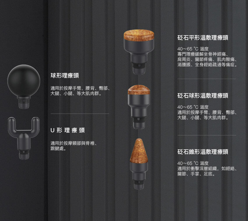 3款專業砭石溫敷理療頭,2款專業軟質的理療頭,提供舒適的理療體驗。